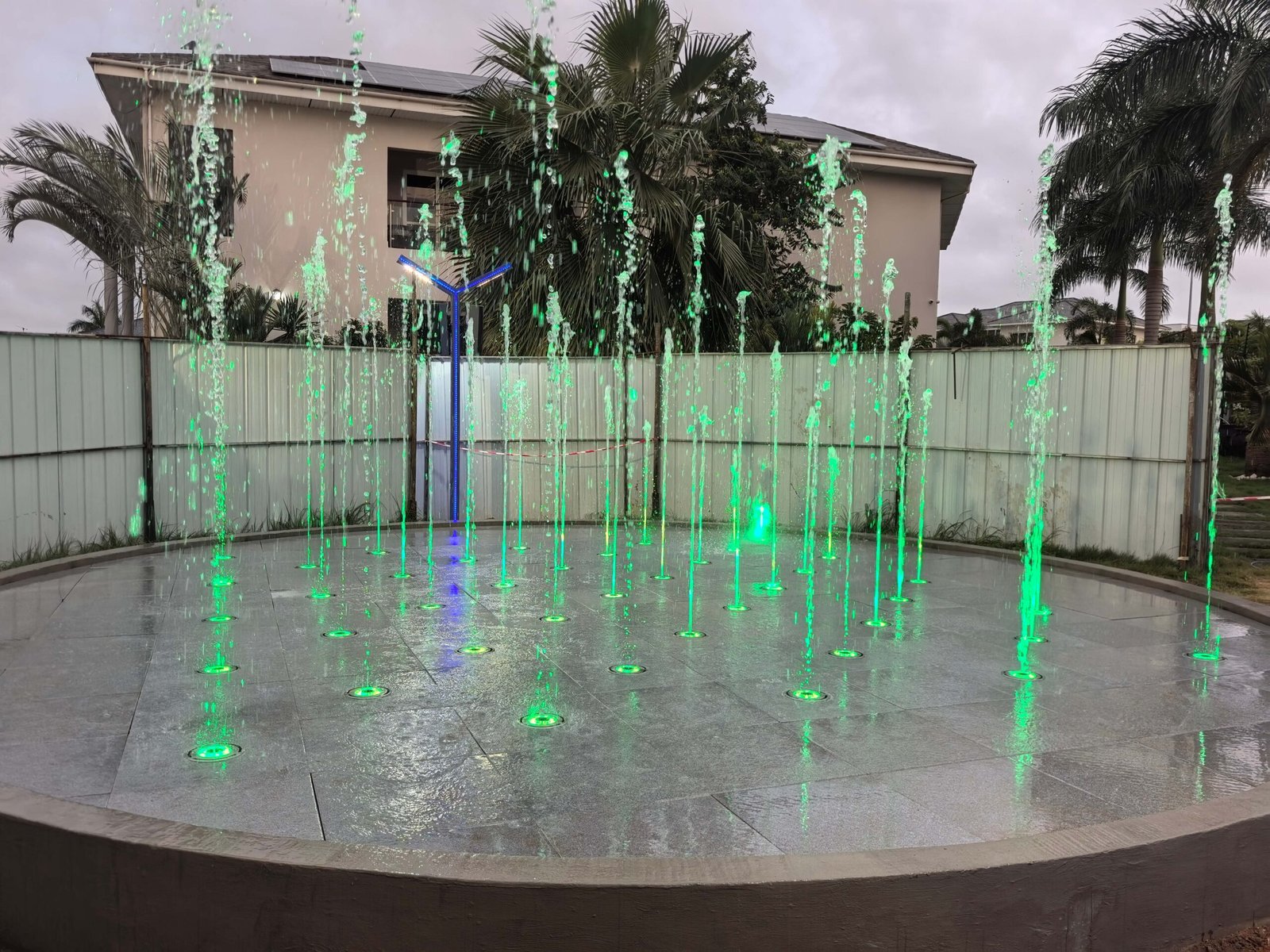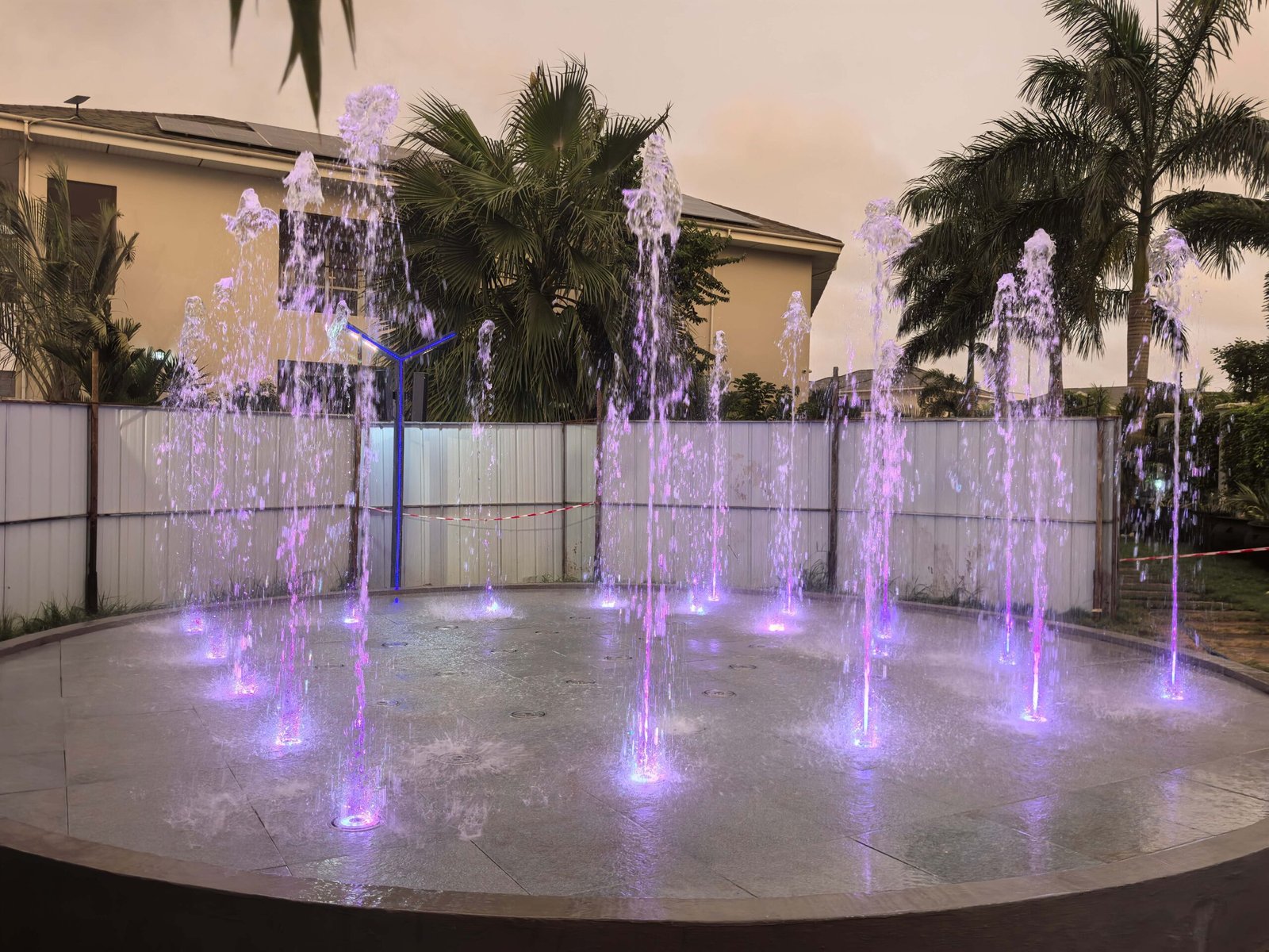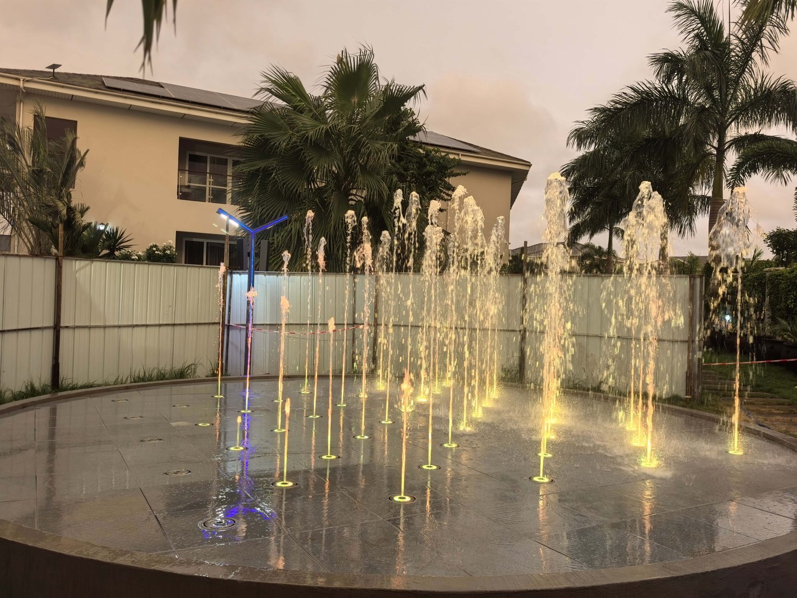 O projeto da Fonte Interativa Seca para o Gabinete da Presidência do Gana, concebido e fabricado pela Changsha Himalaya Music Fountain, apresenta uma estrutura de piscina construída com armação de aço e revestida com mármore. Todos os equipamentos da fonte , estruturas de aço e componentes de mármore foram projetados e produzidos de forma independente pela empresa.