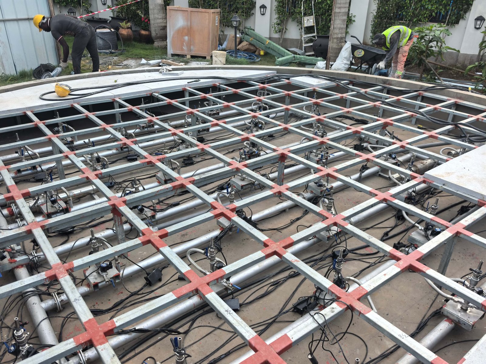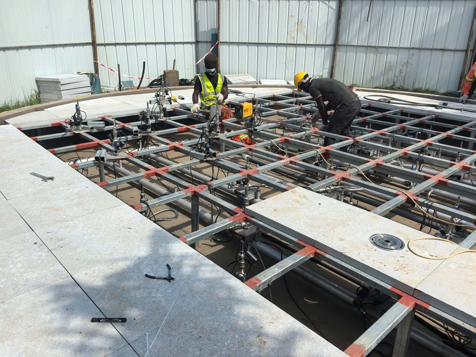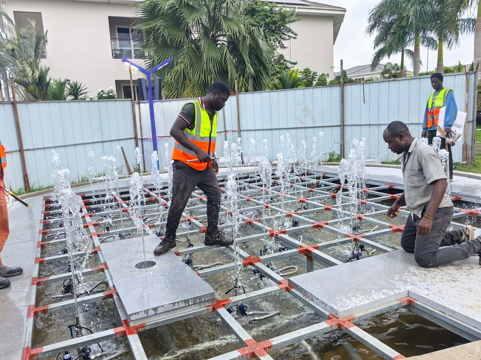 O projeto da Fonte Interativa Seca para o Gabinete da Presidência do Gana, concebido e fabricado pela Changsha Himalaya Music Fountain, apresenta uma estrutura de piscina construída com armação de aço e revestida com mármore. Todos os equipamentos da fonte , estruturas de aço e componentes de mármore foram projetados e produzidos de forma independente pela empresa.